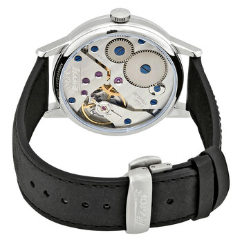 Stainless steel case with a black leather strap. Fixed stainless steel bezel. Silver dial with black leaf-style hands and Arabic numeral hour markers. Minute markers around the outer rim. Dial Type: Analog. Small seconds sub-dial. ETA caliber 6498-1 hand wind movement, containing 17 Jewels, bitting at 19800 vph, and has a power reserve of approximately 46 hours. Scratch resistant sapphire crystal. Pull / push crown. Transparent case back. Round case shape. Case size: 42 mm. Case thickness: 11.4 mm. Band width: 18 mm / 20 mm. Deployment clasp. Water resistant at 50 meters / 165 feet. Functions: hour, minute, small second. Heritage Series. Casual watch style. Watch label: Swiss Made. Tissot Heritage Petite Seconde Automatic Silver Dial Black Leather Men's Watch T119.405.16.037.00.