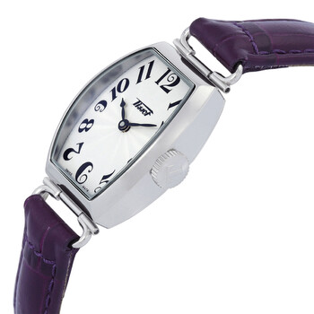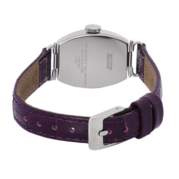 Silver-tone 316L stainless steel case with a purple leather strap. Fixed silver-tone stainless steel bezel. Silver dial with black hands and Arabic numeral hour markers. Dial Type: Analog. ETA Caliber E61.031 quartz movement. Scratch resistant mineral crystal. Pull / push crown. Solid case back. Tonneau case shape, case size: 22.00 mm, case thickness: 8.4 mm. Band width: 12.00 mm. Buckle clasp. Water resistant at 30 meters / 100 feet. Functions: hour, minute. Heritage Series. Casual watch style. Watch label: Swiss Made. Tissot Heritage Quartz Silver Dial Ladies Watch T128.109.16.032.00.