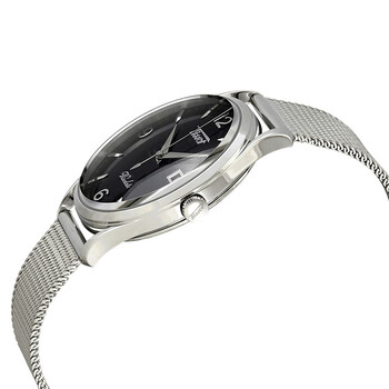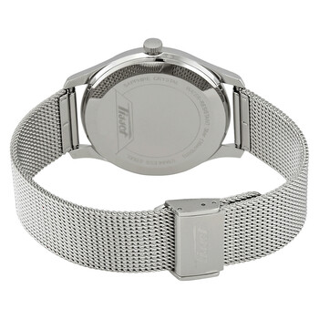 Stainless steel case with a stainless steel mesh bracelet. Fixed stainless steel bezel. Black dial with silver-tone dauphine-style hands and index hour markers. Arabic numerals mark the 3, 6, 9 and 12 o'clock positions. Minute markers around the outer rim. Dial Type: Analog. Date display at the 3 o'clock position. ETA Caliber F06.111 quartz movement. Scratch resistant sapphire crystal. Pull / push crown. Solid case back. Round case shape. Case size: 40 mm. Case thickness: 10.7 mm. Band width: 20 mm. Fold over slip through clasp. Water resistant at 30 meters / 100 feet. Functions: date, hour, minute, second. Heritage Visodate Series. Casual watch style. Watch label: Swiss Made. Tissot Heritage Visodate Black Dial Men's Watch T1184101105700.