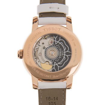 Rose gold PVD 316L stainless steel case with a white (synthetic) leather strap. Fixed rose gold PVD bezel. White dial with rose gold-tone hands and index hour markers. Arabic numerals mark the 3, 6 and 9 o'clock positions. Dial Type: Analog. Powermatic 80.111 automatic movement, containing 23 Jewels, bitting at 28800 vph, and has a power reserve of approximately 80 hours. Scratch resistant sapphire crystal. Pull / push crown. Transparent case back. Round case shape. Case size: 35 mm. Case thickness: 9.75 mm. Band width: 17 mm. Butterfly clasp. Water resistant at 30 meters / 100 feet. Functions: date, hour, minute, second. Additional Info: original box, manual (complete accessories). Luxury watch style. Watch label: Swiss Made. Tissot Lady Heart Automatic White Dial Ladies Watch T050.207.37.017.05.