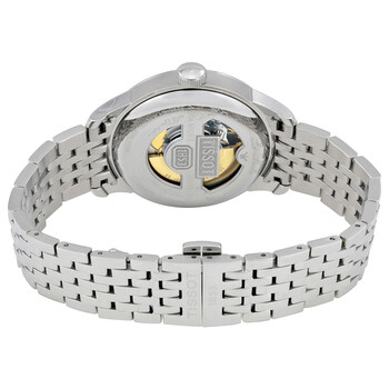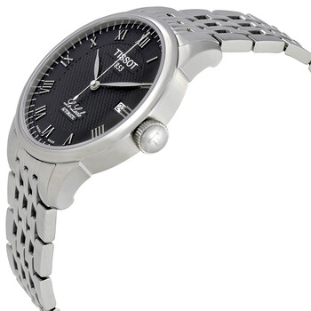 Stainless steel case with a stainless steel bracelet. Fixed stainless steel bezel. Black textured dial with silver-tone hands and Roman numeral hour markers. Minute markers around the outer rim. Dial Type: Analog. Luminescent hands and dial markers. Date display at the 3 o'clock position. Self winding automatic movement with a 38-hour power reserve. Scratch resistant sapphire crystal. Skeletal case back. Case diameter: 39.3 mm. Case thickness: 10 mm. Round case shape. Band width: 20 mm. Band length: 7 inches. Deployment clasp. Water resistant at 30 meters / 100 feet. Functions: hours, minutes, seconds, date. Dress watch style. Watch label: Swiss Made. Tissot Le Locle Men's Watch T41.1.483.53.