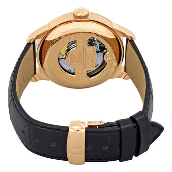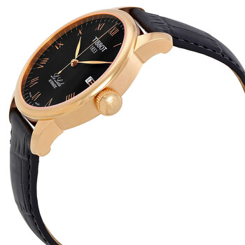 Rose gold PVD stainless steel case with a black leather strap. Fixed rose gold PVD bezel. Black dial with rose gold-tone hands and Roman numeral hour markers. Minute markers around the outer rim. Dial Type: Analog. Date display at the 3 o'clock position. Automatic movement with a 42-hour power reserve. Scratch resistant sapphire crystal. Pull / push crown. Skeleton case back. Case diameter: 39.3 mm. Case thickness: 9.75 mm. Round case shape. Band width: 19 mm. Butterfly clasp. Water resistant at 30 meters / 100 feet. Functions: date, hour, minute, second. Casual watch style. Watch label: Swiss Made. Tissot Le Locle Automatic Black Dial Men's Watch T41542353.