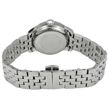 Stainless steel case with a stainless steel bracelet. Fixed stainless steel bezel. Black dial with luminous silver-tone leaf-style hands and diamond hour markers. Roman numerals appear at the 3, 6, 9 and 12 o'clock positions. Minute markers around the outer ring. Dial Type: Analog. Date display at the 3 o'clock position. ETA caliber 2671 automatic movement, containing 25 Jewels, bitting at 28800 vph, and has a power reserve of approximately 38 hours. Scratch resistant sapphire crystal. Pull / push crown. Solid case back. Round case shape. Case size: 25.3 mm. Case thickness: 8.4 mm. Band width: 12 mm. Butterfly clasp. Water resistant at 30 meters / 100 feet. Functions: date, hour, minute, second. Casual watch style. Watch label: Swiss Made. Tissot Le Locle Automatic Black Diamond Dial Ladies Watch T41.1.183.56.