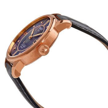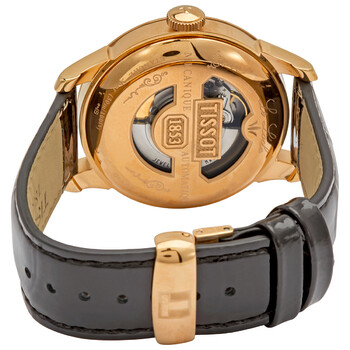 Rose gold PVD stainless steel case with a black leather strap. Fixed rose gold PVD bezel. Black mother of pearl dial with rose gold-tone hands and diamond hour markers. Roman numerals mark the 3, 6, 9 and 12 o'clock positions. Dial Type: Analog. Date display at the 3 o'clock position. ETA caliber 2824-2 automatic movement, based upon ETA 2824, containing 25 Jewels, bitting at 28800 vph, and has a power reserve of approximately 38 hours. Scratch resistant sapphire crystal. Pull / push crown. Transparent case back. Round case shape. Case size: 39.3 mm. Case thickness: 9.75 mm. Band width: 19 mm. Deployment clasp. Water resistant at 30 meters / 100 feet. Functions: date, hour, minute, second. Dress watch style. Watch label: Swiss Made. Tissot Le Locle Automatic Black Mother of Pearl Diamond Dial Men's Watch T41642396.