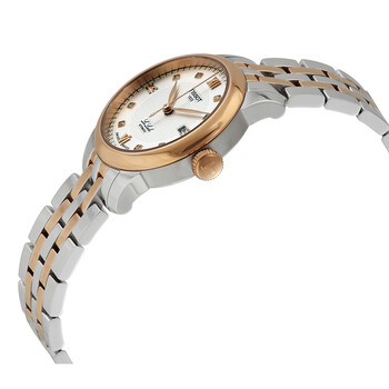 Stainless steel case with a two-tone (silver-tone and rose gold PVD) stainless steel bracelet. Fixed rose gold PVD bezel. Silver dial with rose gold-tone leaf-style hands and diamond hour markers. Roman numerals mark the 3, 6, 9 and 12 o'clock positions. Minute markers around the outer rim. Dial Type: Analog. Date display at the 3 o'clock position. ETA caliber 2671 Automatic movement, containing 25 Jewels, bitting at 28800 vph, and has a power reserve of approximately 38 hours. Scratch resistant sapphire crystal. Pull / push crown. Transparent case back. Round case shape. Case size: 29 mm. Case thickness: 8.95 mm. Butterfly clasp. Water resistant at 30 meters / 100 feet. Functions: date, hour, minute, second. Casual watch style. Watch label: Swiss Made. Tissot Le Locle Automatic Diamond Silver Dial Ladies Watch T006.207.22.036.00.