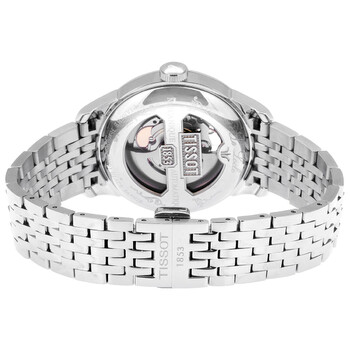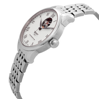 Silver-tone stainless steel case and bracelet. Fixed silver-tone stainless steel bezel. Silver dial with silver-tone hands and Roman numeral hour markers. Minute markers around the outer rim. Dial Type: Analog. Tissot Calibre Powermatic 80.601 Automatic movement, based upon Tissot Calibre Powermatic 80, containing 23 Jewels, bitting at 21600 vph, and has a power reserve of approximately 80 hours. Scratch resistant sapphire crystal. Pull / push crown. Transparent case back. Round case shape, case size: 39.3 mm, case thickness: 9.8 mm. Band width: 19 mm. Butterfly clasp. Water resistant at 30 meters / 100 feet. Functions: hour, minute, second. Le Locle Series. Casual watch style. Watch label: Swiss Made. Tissot Le Locle Automatic Open Heart Silver Dial Men's Watch T0064071103302.