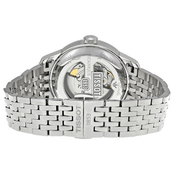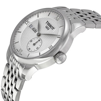Stainless steel case with a stainless steel bracelet. Fixed stainless steel bezel. Silver dial with silver-tone leaf-style shape hands and index hour markers. Roman numerals mark the 3, 6, 9 and 12 o'clock positions. Minute markers around the outer rim. Dial Type: Analog. Date display at the 9 o'clock position. Small second sub-dial at the 5 o'clock position. ETA caliber 2825-2 automatic movement, based upon ETA 2824-2, containing 25 Jewels, bitting at 28800 vph, and has a power reserve of approximately 42 hours. Scratch resistant sapphire crystal. Transparent case back. Round case shape. Case size: 38.5 mm. Case thickness: 11 mm. Band width: 19 mm. Fold over clasp with a safety release. Water resistant at 30 meters / 100 feet. Functions: date, hour, minute, small second. Dress watch style. Watch label: Swiss Made. Tissot Le Locle Automatic Silver Dial Men's Watch T006.428.11.038.00.