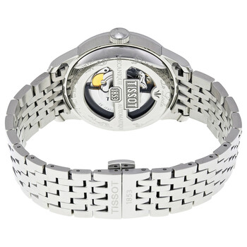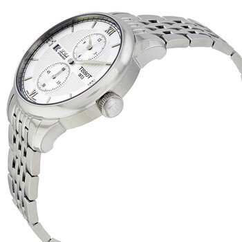 Stainless steel case with a stainless steel bracelet. Fixed stainless steel bezel. Silver dial with silver-tone leaf-style shape hands and index hour markers. Roman numerals mark the 3, 6, 9 and 12 o'clock positions. Minute markers around the outer rim. Dial Type: Analog. Date display at the 9 o'clock position. Two sub-dials displaying: small seconds and 12 hours. ETA caliber 2825-2 automatic movement, based upon ETA 2824-2, containing 25 Jewels, bitting at 28800 vph, and has a power reserve of approximately 42 hours. Scratch resistant sapphire crystal. Pull / push crown. Transparent case back. Round case shape. Case size: 39 mm. Case thickness: 11.55 mm. Band width: 19 mm. Band length: 8 inches. Deployment clasp with a push button release. Water resistant at 30 meters / 100 feet. Functions: date, hour, minute, second. Le locle series. Dress watch style. Watch label: Swiss Made. Tissot Le Locle Automatic Silver Dial Men's Watch T006.428.11.038.02.