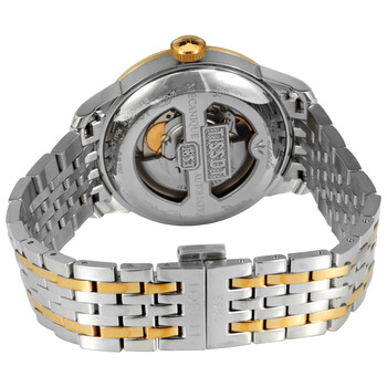 Silver-tone stainless steel case with a two-tone (silver-tone and yellow gold PVD) stainless steel bracelet. Fixed yellow gold PVD stainless steel bezel. Silver dial with gold-tone hands and Arabic numeral hour markers. Minute markers around the outer rim. Dial Type: Analog. Date display at the 3 o'clock position. One subdial displaying: small second. ETA Caliber 2825-2 Automatic movement, based upon ETA 2824-2, containing 25 Jewels, bitting at 28800 vph, and has a power reserve of approximately 42 hours. Scratch resistant sapphire crystal. Pull / push crown. Transparent case back. Round case shape, case size: 39.3 mm, case thickness: 11.6 mm. Band width: 19 mm. Deployment with push button release clasp. Water resistant at 30 meters / 100 feet. Functions: date, hour, minute, small second. Le Locle Series. Dress watch style. Watch label: Swiss Made. Tissot Le Locle Automatic Silver Dial Men's Watch T006.428.22.032.00.