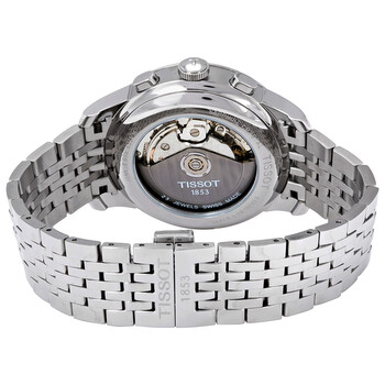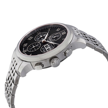 Stainless steel case with a stainless steel bracelet. Fixed stainless steel bezel. Black dial with silver-tone leaf-style hands and Roman numeral hour markers. Minute markers around the outer rim. Dial Type: Analog. Day of the week and date display at the 3 o'clock position. Chronograph - three sub-dials displaying: 60 second, 30 minute and 12 hour. VALJOUX A05.H21 automatic movement, based upon ETA 7750, containing 25 Jewels, bitting at 28800 vph, and has a power reserve of approximately 60 hours. Scratch resistant sapphire crystal. Transparent case back. Round case shape. Case size: 42.3 mm. Case thickness: 13.2 mm. Band width: 20 mm. Deployment clasp. Water resistant at 50 meters / 165 feet. Functions: chronograph, date, day of the week, hour, minute, second. Le Locle Valjoux Series. Sport watch style. Watch label: Swiss Made. Tissot Le Locle Valjoux Automatic Chronograh Men's T006.414.11.053.00.
