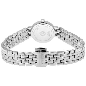Stainless steel case with a stainless steel bracelet. Fixed silver-tone bezel set with 37 wesselton diamonds. Mother of pearl dial with silver-tone hands and index hour markers. Dial Type: Analog. ETA 901.001 quartz movement. Scratch resistant sapphire crystal. Pull / push crown. Solid case back. Case size: 19.5 mm. Case thickness: 5 mm. Round case shape. Butterfly clasp. Water resistant at 30 meters / 100 feet. Functions: hour, minute. Dress watch style. Watch label: Swiss Made. Tissot Lovely mother of Pearl Dial Stainless Steel Ladies Watch T058.009.61.116.00.