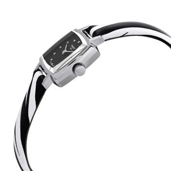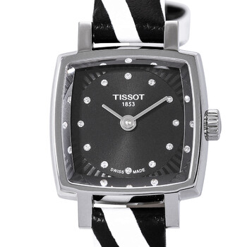 Silver-tone stainless steel case with a two-tone (black and white) synthetic band. Fixed silver-tone stainless steel bezel. Black dial with silver-tone hands and index and diamond hour markers. Dial Type: Analog. ETA Caliber 901.001 quartz movement. Scratch resistant sapphire crystal. Solid case back. Cushion case shape, case size: 20 mm, case thickness: 7.1 mm. Band width: 9.00 mm. Buckle clasp. Water resistant at 30 meters / 100 feet. Functions: hour, minute. Lovely Series. Dress watch style. Watch label: Swiss Made. Tissot Lovely Quartz Diamond Black Dial Ladies Watch T058.109.17.056.00.