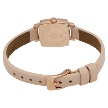 Rose gold PVD stainless steel case with a pink leather strap. Fixed rose gold PVD bezel. Silver dial with rose gold-tone hands and index hour markers. Dial Type: Analog. ETA caliber 901.001 quartz movement. Scratch resistant sapphire crystal. Pull / push crown. Solid case back. Cushion case shape. Case size: 20 mm. Case thickness: 7.1 mm. Band width: 9 mm. Tang clasp. Water resistant at 30 meters / 100 feet. Functions: hour, minute. Casual watch style. Watch label: Swiss Made. Tissot Lovely Quartz Silver Dial Ladies Watch T058.109.36.031.00.