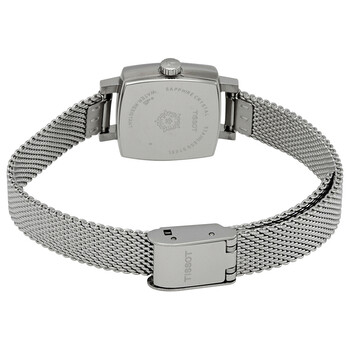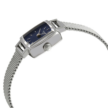 Stainless steel case with a stainless steel mesh bracelet. Fixed stainless steel bezel. Blue dial with silver-tone hands and index hour markers. Dial Type: Analog. ETA caliber 901.001 quartz movement. Scratch resistant sapphire crystal. Pull / push crown. Solid case back. Cushion case shape. Case size: 20 mm. Case thickness: 7.1 mm. Band width: 9 mm. Jewelry clasp. Water resistant at 30 meters / 100 feet. Functions: hour, minute. Casual watch style. Watch label: Swiss Made. Tissot Lovely Square Quartz Blue Dial Ladies Watch T058.109.11.041.00.