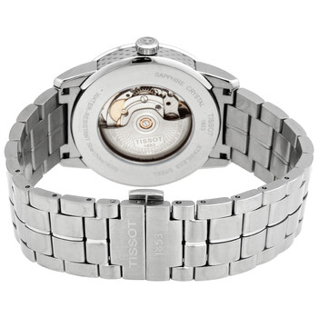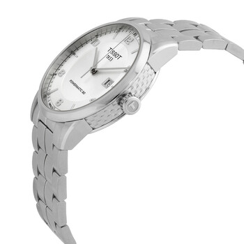 Stainless steel case with a stainless steel bracelet. Fixed stainless steel bezel. Silver dial with silver-tone hands and alternating index and Arabic numeral hour markers. Minute markers around the outer rim. Dial Type: Analog. Date display at the 3 o'clock position. Caliber: Powermatic 80.111 automatic movement with an 80-hour power reserve. Scratch resistant sapphire crystal. Pull / push crown. Transparent case back. Round case shape. Case size: 41 mm. Case thickness: 9.8 mm. Band width: 22 mm. Deployment clasp with a push button release. Water resistant at 50 meters / 165 feet. Functions: date, hour, minute, second. Luxury Series. Casual watch style. Watch label: Swiss Made. Tissot Luxury Automatic Silver Dial Men's Watch T086.407.11.037.00.