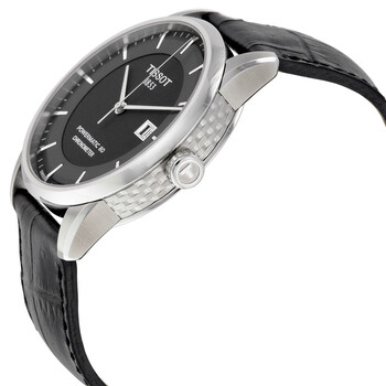 Stainless steel case with a black (alligator) leather strap. Fixed stainless steel bezel. Black dial with silver-tone hands and stick hour markers. Minute markers around the outer rim. Dial Type: Analog. Date display at the 3 o'clock position. Automatic movement with an 80-hour power reserve. Scratch resistant sapphire crystal. Skeleton case back. Case diameter: 41 mm. Case thickness: 9.5 mm. Round case shape. Strap width: 22 mm. Deployment clasp with a push button release. Water resistant at 50 meters / 165 feet. Functions: date, hour, minute, second. Dress watch style. Watch label: Swiss Made. Tissot Luxury Automatic Stainless Steel Black Dial Stainless Steel Black Leather Men's Watch T0864081605100.