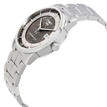 Stainless steel case with a stainless steel bracelet. Fixed stainless steel bezel. Anthracite dial with silver-tone hands and index hour markers. Minute markers around the outer rim. Dial Type: Analog. Date display at the 3 o'clock position. Tissot calibre Powermatic 80 (C07.111) automatic movement, based upon ETA 2824-2, containing 23 Jewels, bitting at 21600 vph, and has a power reserve of approximately 80 hours. Scratch resistant sapphire crystal. Pull / push crown. Transparent case back. Round case shape. Case size: 41 mm. Case thickness: 9.75 mm. Band width: 22 mm. Fold over clasp. Water resistant at 50 meters / 165 feet. Functions: date, hour, minute, second. Luxury Series. Dress watch style. Watch label: Swiss Made. Tissot Luxury Powermatic 80 Anthracite Dial Men's Watch T086.407.11.061.10.