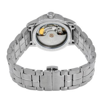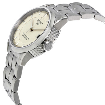 Stainless steel case with a stainless steel bracelet. Fixed stainless steel bezel. Ivory dial with silver-tone hands and index hour markers. Minute markers around the outer rim. Dial Type: Analog. Date display at the 3 o'clock position. Tissot calibre Powermatic 80 COSC automatic movement with an 80-hour power reserve. Scratch resistant sapphire crystal. Pull / push crown. Skeleton case back. Round case shape. Case size: 33 mm. Case thickness: 9.7 mm. Band width: 18 mm. Fold over clasp with a push button release. Water resistant at 50 meters / 165 feet. Functions: date, hour, minute, second, chronometer. Casual watch style. Watch label: Swiss Made. Item Variations: T086 208 11 261 00, T086-208-11-261-00, T086/208/11/261/00, T0862081126100. Tissot Luxury Powermatic 80 Ivory Dial Ladies Watch T086.208.11.261.00.