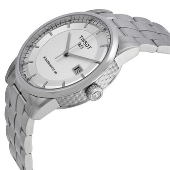 Stainless steel case with a stainless steel bracelet. Fixed stainless steel bezel. Silver dial with silver-tone hands and index hour markers. Minute markers around the outer rim. Dial Type: Analog. Luminescent hands and markers. Date display at the 3 o'clock position. Tissot calibre Powermatic 80 (C07.111) automatic movement, based upon ETA 2824-2, containing 23 Jewels, bitting at 21600 vph, and has a power reserve of approximately 80 hours. Scratch resistant sapphire crystal. Pull / push crown. Skeleton case back. Round case shape. Case size: 42 mm. Case thickness: 10 mm. Band width: 22 mm. Band length: 8 inches. Butterfly clasp. Water resistant at 50 meters / 165 feet. Functions: date, hour, minute, second. Luxury Automatic Series. Casual watch style. Watch label: Swiss Made. Tissot Luxury Powermatic 80 Silver Dial Men's Watch T0864071103100.