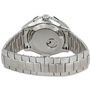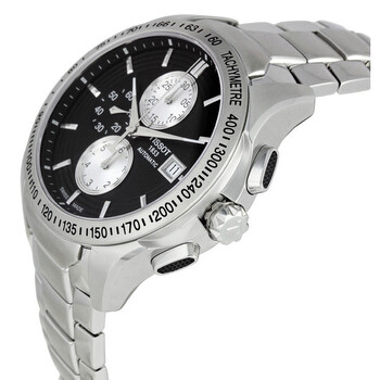 Stainless steel case with a stainless steel bracelet. Fixed stainless steel showing tachymeter markings bezel. Black dial with silver tone hands and stick hour markers. Minute markers around the outer rim. Dial Type: Analog. Luminescent hands and markers. Date display at the 3 o'clock position. Chronograph - three sub-dials displaying: 60 seconds, 30 minutes and 6 hours. ETA caliber C01.211 automatic movement with a 46-hour power reserve. Scratch resistant sapphire crystal. Solid case back. Case size: 45 mm. Case thickness: 14 mm. Round case shape. Band width: 20 mm. Deployment clasp. Water resistant at 100 meters / 330 feet. Functions: chronograph, date, hour, minute, second, tachymeter. Sport watch style. Watch label: Swiss made. Item Variations: T0244271105100. Tissot Men's Veloci T Chronograph Black Dial Watch T0244271105100.