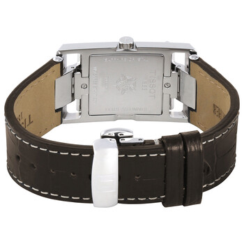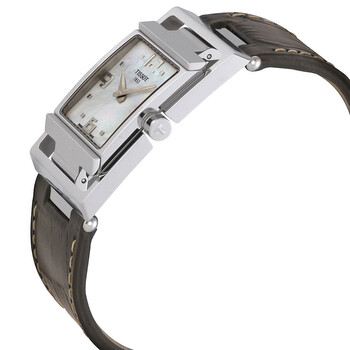 Stainless steel case with a black leather strap. Fixed stainless steel bezel. Mother of pearl dial with silver-tone hands and dot hour markers. Arabic numerals mark the 3, 6, 9, and 12 o'clock position. Dial Type: Analog. ETA caliber 901.005 quartz movement. Scratch resistant sapphire crystal. Pull / push crown. Solid case back. Rectangle case shape. Case dimensions: 41 mm x 25 mm. Case thickness: 6.3 mm. Band width: 18 mm. Deployment clasp. Water resistant at 30 meters / 100 feet. Functions: hours, minutes. Dress watch style. Watch label: Swiss Made. Item Variations: T0323091611700. Tissot My T Mother of Pearl Dial Ladies Watch T032.309.16.117.00.