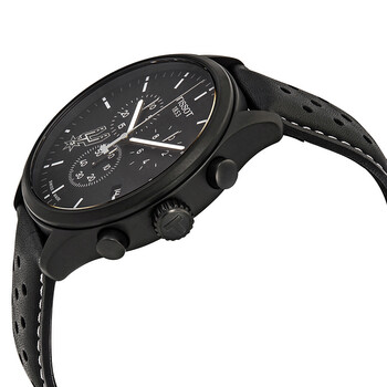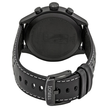 Black PVD stainless steel case with a black leather strap. Fixed black PVD bezel. Black (San Antonio Spurs) dial with luminous silver-tone hands and index hour markers. Minute markers around the outer rim. Dial Type: Analog. Luminescent hands and markers. Date display at the 4 o'clock position. Chronograph - three sub-dials displaying: 60 second, 30 minute and 1/10th of a second. ETA caliber G10.212 quartz movement. Scratch resistant sapphire crystal. Solid case back. Round case shape. Case size: 45 mm. Case thickness: 11 mm. Band width: 22 mm. Tang clasp. Water resistant at 100 meters / 330 feet. Functions: chronograph, rattrapante, date, hour, minute, small second. Nba Teams Special San Antonio Spurs Edition Series. Sport watch style. Watch label: Swiss Made. Tissot NBA Teams Special San Antonio Spurs Edition Chronograph Men's Watch T116.617.36.051.04.