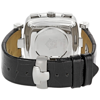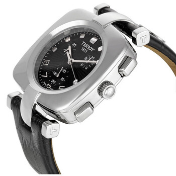 Stainless steel case with a black leather bracelet. Fixed bezel. Black dial with silver-tone hands and index hour markers. Arabic numerals mark the 5, 6, 7 and 8 o'clock positions. Minute markers around the outer rim. Date display appears at the 4 o'clock position. Chronograph - three sub-dials displaying: 1/10th seconds, 30 minutes and 60 seconds. Quartz movement. Scratch resistant sapphire crystal. Case diameter: 30 mm. Case thickness: 5.8 mm. Water resistant at 30 meters/ 100 feet. Functions: hours, minutes, seconds, date, chronograph. Tissot Odaci T Black Dial Chronograph Ladies Watch T0203171605700.
