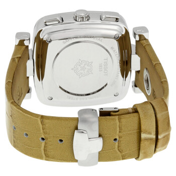 Silver-tone stainless steel case with a beige leather strap. Fixed silver-tone stainless steel bezel. Silver dial with silver-tone hands and index and Arabic numeral hour markers. Minute markers around the outer rim. Dial Type: Analog. Date display at the 4 o'clock position. Chronograph - three sub-dials displaying: 60 second, 30 minute and 1/10th of a second. ETA Caliber G15.211 quartz movement. Scratch resistant sapphire crystal. Pull / push crown. Solid case back. Cushion case shape, case size: 37 mm, case thickness: 7 mm. Band width: 16 mm. Tang clasp. Water resistant at 30 meters / 100 feet. Functions: chronograph, date, hour, minute, second. Additional Info: withstands rain and splashes of water, but not showering or submersion. Casual watch style. Watch label: Swiss Made. Item Variations: T0203171603700. Tissot Odaci-T Chronograph Silver Dial Ladies Watch T0203171603700.