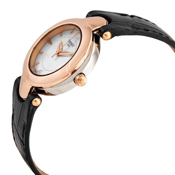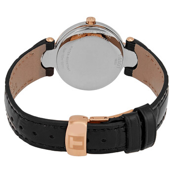 Stainless steel case with a black leather strap. Fixed rose gold PVD bezel. White mother of pearl dial with rose gold-tone skeleton hands and index hour markers. Arabic numerals appear at the 6 and 12 o'clock positions. Dial Type: Analog. ETA caliber 956.112 quartz movement. Scratch resistant sapphire crystal. Pull / push crown. Solid case back. Round case shape. Case size: 36.28 mm. Case thickness: 6.48 mm. Butterfly clasp. Water resistant at 30 meters / 100 feet. Functions: hour, minute, second. Organdy Series. Dress watch style. Watch label: Swiss Made. Tissot Organdy Ladies Watch T916.209.46.117.01.