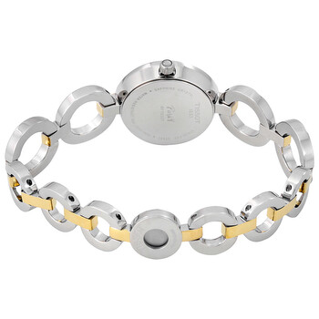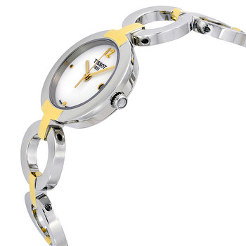 Stainless steel case with a stainless steel bracelet with yellow gold PVD links. Fixed two-tone stainless steel bezel. White dial with yellow gold-tone hands. Dot markers at the 3, 6, and 9 o'clock positions. An Arabic numeral appears at the 12 o'clock position. Dial Type: Analog. Date display at the 3 o'clock position. ETA caliber F03.111 quartz movement. Scratch resistant sapphire crystal. Pull / push crown. Solid case back. Round case shape. Case size: 27.95 mm. Case thickness: 6.49 mm. Jewelry clasp. Water resistant at 30 meters / 100 feet. Functions: date, hour, minute, second. Dress watch style. Watch label: Swiss Made. Tissot Pinky White Dial Ladies Watch T0842102201700.