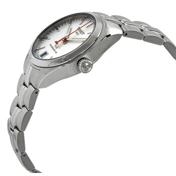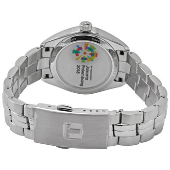 Stainless steel case with a stainless steel bracelet. Fixed stainless steel bezel. White dial with luminous silver-tone hands and index hour markers. Minute markers around the outer rim. Dial Type: Analog. Luminescent hands. Date display at the 6 o'clock position. Tissot calibre Powermatic 80 (C07.111) automatic movement, based upon ETA 2824-2, containing 23 Jewels, bitting at 21600 vph, and has a power reserve of approximately 80 hours. Scratch resistant sapphire crystal. Pull / push crown. Solid case back. Round case shape. Case size: 33 mm. Case thickness: 9.8 mm. Band width: 16 mm. Fold over clasp with a push button release. Water resistant at 100 meters / 330 feet. Functions: date, hour, minute, second. Powermatic 80 Asian Games Edition Series. Casual watch style. Watch label: Swiss Made. Tissot Powermatic 80 Asian Games Edition Automatic Ladies Watch T101.207.11.011.00.