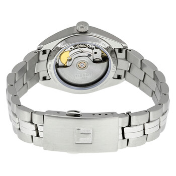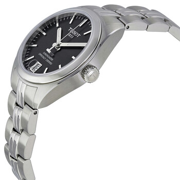Stainless steel case with a stainless steel bracelet. Fixed stainless steel bezel. Black dial with luminous silver-tone hands and index hour markers. Minute markers around the outer rim. Dial Type: Analog. Luminescent hands. Date display at the 6 o'clock position. Tissot calibre Powermatic 80 COSC automatic movement with about 80 hours of power reserve. Scratch resistant sapphire crystal. Skeleton case back. Case size: 33 mm. Case thickness: 9.79 mm. Round case shape. Bracelet width: 16 mm. Fold over clasp. Water resistant at 100 meters / 330 feet. Functions: date, hour, minute, second, chronometer. Dress watch style. Watch label: Swiss Made. Tissot PR 100 Automatic Black Dial Ladies Watch T101.208.11.051.00.