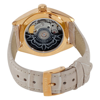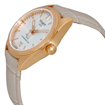 Rose gold-tone stainless steel case with a cream leather strap. Fixed rose gold-tone bezel. Silver dial with luminous rose gold-tone hands and index hour markers. Minute markers around the outer rim. Dial Type: Analog. Luminescent hands. Date display at the 6 o'clock position. Tissot calibre Powermatic 80 automatic movement with an 80-hour power reserve. Scratch resistant sapphire crystal. Skeleton case back. Case size: 33 mm. Case thickness: 9.79 mm. Round case shape. Strap width: 16 mm. Tang clasp. Water resistant at 100 meters / 330 feet. Functions: date, hour, minute, second. Dress watch style. Watch label: Swiss Made. Tissot PR 100 Automatic Silver Dial Ladies Watch T101.207.36.031.00.