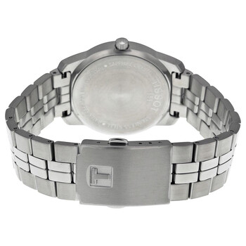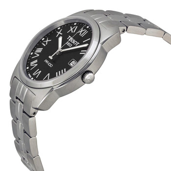 Stainless steel case with a stainless steel link bracelet. Fixed stainless steel bezel. Black dial with luminous hands and Roman numeral hour markers. Minute markers around the outer rim. Luminescent hands and markers. Date display at the 3 o'clock position. Swiss quartz movement. Scratch resistant sapphire crystal. Solid case back. Case diameter: 38 mm. Case thickness: 9 mm. Fold over clasp with push button release. Water resistant at 100 meters / 330 feet. Tissot PR 100 Black Dial Bracelet Men's Watch T0494101105301