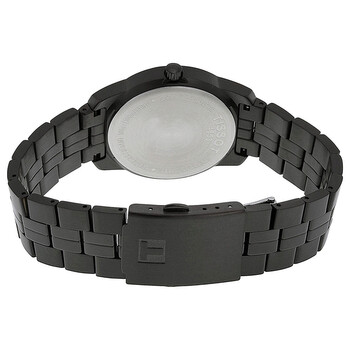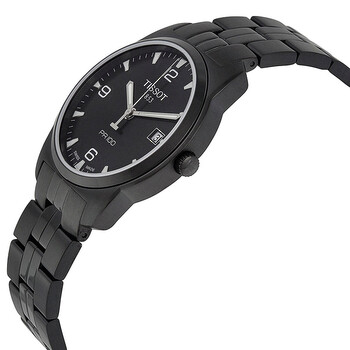 Black ion-plated stainless steel case and bracelet. Fixed Black Ion-plated bezel. Black dial with luminous hands and stick hour markers. Arabic numerals mark the 6. 9 and 12 o'clock positions. Minute markers around the outer rim. The Tissot name appears below the 12 o'clock position. Date displays at the 3 o'clock position. Quartz movement. Scratch resistant sapphire crystal. Screw down crown. Solid case back. Case diameter: 38 mm. Case thickness: 9 mm. Deployment clasp. Water resistant at 100 meters/ 330 feet. Functions: hours, minutes, seconds, date. Tissot PR 100 Black Steel Men's Watch T049.410.33.057.00.