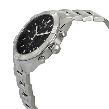 Stainless steel case with a stainless steel bracelet. Fixed stainless steel bezel. Black dial with luminous silver-tone hands and index hour markers. Minute markers around the outer rim. Dial Type: Analog. Luminescent hands and markers. Date display between the 4 and 5 o'clock positions. Chronograph - three sub-dials displaying: 60 second, 30 minute and 1/10th of a second. ETA caliber G10.212 quartz movement. Scratch resistant sapphire crystal. Solid case back. Round case shape. Case size: 44 mm. Case thickness: 11.1 mm. Band width: 22 mm. Fold over clasp with a push button release. Water resistant at 100 meters / 330 feet. Functions: chronograph, rattrapante, date, hour, minute, small second. Pr 100 Series. Sport watch style. Watch label: Swiss Made. Tissot PR 100 Chronograph Quartz Black Dial Men's Watch T101.617.11.051.00.
