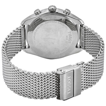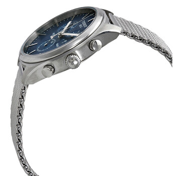 Stainless steel case with a stainless steel mesh bracelet. Fixed stainless steel bezel. Blue dial with luminous silver-tone hands and index hour markers. Minute markers around the outer rim. Dial Type: Analog. Luminescent hands and markers. Date display between the 4 and 5 o'clock positions. Chronograph - three sub-dials displaying: 60 second, 60 minute and 12 hour. ETA caliber G10.211 quartz movement. Scratch resistant sapphire crystal. Solid case back. Round case shape. Case size: 41 mm. Case thickness: 10.7 mm. Band width: 20 mm. Fold over slip through clasp. Water resistant at 100 meters / 330 feet. Functions: chronograph, date, hour, minute, second. Casual watch style. Watch label: Swiss Made. Tissot PR 100 Chronograph Quartz Blue Dial Men's Watch T101.417.11.041.00.