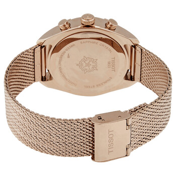 Rose gold PVD stainless steel case with a rose gold PVD stainless steel mesh bracelet. Fixed rose gold PVD bezel. Silver dial with luminous rose gold-tone hands and index hour markers. Minute markers around the outer rim. Dial Type: Analog. Luminescent hands. Date display at the 4 o'clock position. Chronograph - three sub-dials displaying: 60 second, 30 minute and 1/10th of a second. Caliber ETA G15.212 quartz movement. Scratch resistant sapphire crystal. Pull / push crown. Solid case back. Round case shape. Case size: 38 mm. Case thickness: 10.5 mm. Band width: 19 mm. Water resistant at 100 meters / 330 feet. Functions: chronograph, date, hour, minute, second. Pr 100 Series. Casual watch style. Watch label: Swiss Made. Tissot PR 100 Chronograph Quartz Silver Dial Men's Watch T101.917.33.031.00.