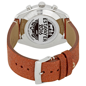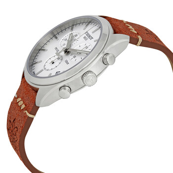 Silver-tone stainless steel case with a light brown leather strap. Fixed stainless steel bezel. Silver dial with silver-tone hands and index hour markers. Dial Type: Analog. Luminescent hands. Date display between 4 and 5 o'clock position. Chronograph - three sub-dials displaying: 60 second, 30 minute and 1/10th of a second. ETA G10.211 quartz movement. Scratch resistant sapphire crystal. Solid case back. Round case shape, case size: 41 mm, case thickness: 11.7 mm. Band width: 20 mm. Water resistant at 100 meters / 330 feet. Functions: chronograph, date, hour, minute, second. Tissot PR 100 Chronograph Silver Dial Men's Watch T101.417.16.031.01.