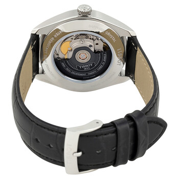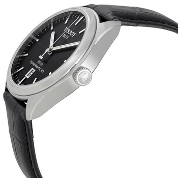 Stainless steel case with a black leather strap. Fixed stainless steel bezel. Black dial with luminous silver-tone hands and index hour markers. Minute markers around the outer rim. Dial Type: Analog. Luminescent hands. Date display at the 6 o'clock position. Tissot calibre Powermatic 80 (C07.111) automatic movement, based upon ETA 2824-2, containing 23 Jewels, bitting at 21600 vph, and has a power reserve of approximately 80 hours. Scratch resistant sapphire crystal. Transparent case back. Round case shape. Case size: 39 mm. Case thickness: 10.39 mm. Band width: 20 mm. Fold over clasp. Water resistant at 100 meters / 330 feet. Functions: date, hour, minute, second. Pr 100 Series. Dress watch style. Watch label: Swiss Made. Tissot PR 100 Powermatic 80 Black Dial Men's Watch T101.407.16.051.00.