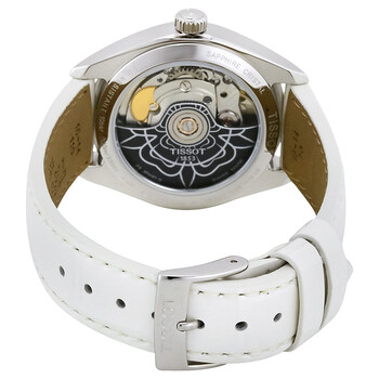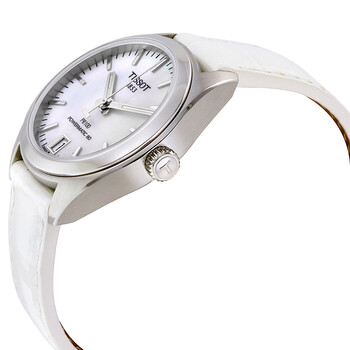 Stainless steel case with a white leather strap. Fixed stainless steel bezel. White mother of pearl dial with luminous silver-tone hands and index hour markers. Minute markers around the outer rim. Dial Type: Analog. Luminescent hands. Date display at the 6 o'clock position. Powermatic 80 automatic movement with an 80-hour power reserve. Scratch resistant sapphire crystal. Transparent case back. Case size: 33 mm. Case thickness: 9.79 mm. Round case shape. Strap width: 16 mm. Tang clasp. Water resistant at 100 meters / 330 feet. Functions: date, hour, minute, second. Dress watch style. Watch label: Swiss Made. Tissot PR 100 Powermatic White Mother of Pearl Ladies Watch T101.207.16.111.00.