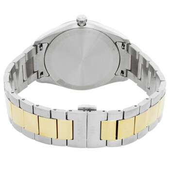 Silver-tone stainless steel case with a two-tone (silver-tone and yellow gold PVD) stainless steel bracelet. Fixed yellow gold PVD stainless steel bezel. Blue dial with yellow gold-tone hands and index hour markers. Minute markers around the outer rim. Dial Type: Analog. Luminescent hands and markers. Date display at the 3 o'clock position. Renata 371 quartz movement. Scratch resistant sapphire crystal. Pull / push crown. Solid case back. Round case shape, case size: 40 mm, case thickness: 8.3 mm. Band width: 20 mm. Butterfly clasp. Water resistant at 100 meters / 330 feet. Functions: date, hour, minute, second. Pr 100 Series. Casual watch style. Watch label: Swiss Made. Tissot PR 100 Quartz Blue Dial Two-Tone Men's Watch T1504102204100.