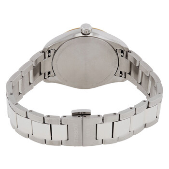 Silver-tone stainless steel case and bracelet. Fixed yellow gold PVD stainless steel bezel. Silver dial with gold-tone hands and index hour markers. Minute markers around the outer rim. Dial Type: Analog. Luminescent hands and markers. Date display at the 3 o'clock position. Renata 371 quartz movement. Scratch resistant sapphire crystal. Pull / push crown. Solid case back. Round case shape, case size: 34 mm, case thickness: 8.3 mm. Band width: 16 mm. Butterfly clasp. Water resistant at 100 meters / 330 feet. Functions: date, hour, minute, second. Pr 100 Series. Casual watch style. Watch label: Swiss Made. Tissot PR 100 Quartz Silver Dial Ladies Watch T1502102103100.