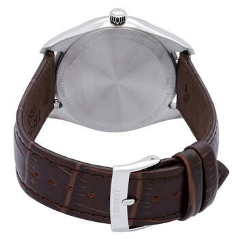 Silver-tone stainless steel case with a brown alligator leather strap. Fixed silver-tone stainless steel bezel. Silver dial with rose gold-tone hands and index hour markers. Minute markers around the outer rim. Dial Type: Analog. Luminescent hands and markers. Date display at the 3 o'clock position. Renata 371 quartz movement. Scratch resistant sapphire crystal. Pull / push crown. Solid case back. Round case shape, case size: 40 mm, case thickness: 8.3 mm. Band width: 20 mm. Tang clasp. Water resistant at 100 meters / 330 feet. Functions: date, hour, minute, second. Pr 100 Series. Casual watch style. Watch label: Swiss Made. Tissot PR 100 Quartz Silver Dial Men's Watch T1504101603100.