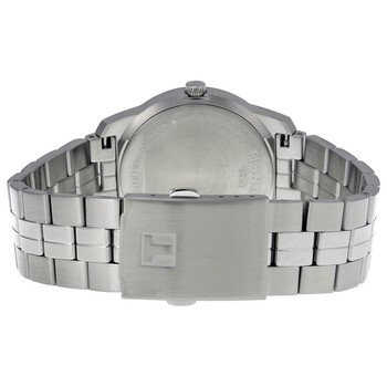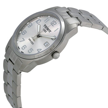 Stainless steel case with a stainless steel link bracelet. Fixed stainless steel bezel. Silver dial with luminous silver-tone hands and Arabic numeral hour markers. Minute markers around the outer rim. Luminescent hands and markers. Date display at the 3 o'clock position. Swiss quartz movement. Scratch resistant sapphire crystal. Solid case back. Case diameter: 38 mm. Case thickness: 9 mm. Push button deployment clasp. Water resistant at 100 meters / 330 feet. Functions: hours, minutes, seconds, date. Tissot PR 100 Silver Dial Bracelet Men's Watch T0494101103201.