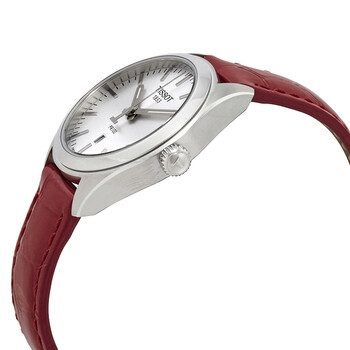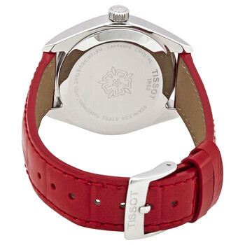 Stainless steel case with a red leather strap. Fixed stainless steel bezel. Silver dial with luminous silver-tone hands and index hour markers. Minute markers around the outer rim. Dial Type: Analog. Luminescent hands and markers. Date display above the 6 o'clock position. Quartz movement. Scratch resistant sapphire crystal. Pull / push crown. Solid case back. Round case shape. Case size: 33 mm. Case thickness: 9 mm. Band width: 16 mm. Tang clasp. Water resistant at 100 meters / 330 feet. Functions: date, hour, minute, second. Casual watch style. Watch label: Swiss Made. Tissot PR 100 Silver Dial Red Leather Ladies Watch T101.210.16.031.03.
