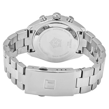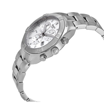 Stainless steel case with a stainless steel bracelet. Fixed stainless steel bezel. Silver dial with luminous silver-tone hands and index hour markers. Minute markers around the outer rim. Dial Type: Analog. Luminescent hands and markers. Date display at the 4 o'clock position. Chronograph - three sub-dials displaying: 60 second, 30 minute and 12 hour. ETA caliber G15.212 AA quartz movement. Scratch resistant sapphire crystal. Solid case back. Round case shape. Case size: 38 mm. Case thickness: 10 mm. Band width: 19 mm. Fold over clasp. Water resistant at 30 meters / 100 feet. Functions: chronograph, date, hour, minute, second. Pr 100 Sport Chic Series. Sport watch style. Watch label: Swiss Made. Tissot PR 100 Sport Chic Chronograph Quartz Silver Dial Watch T101.917.11.031.00.