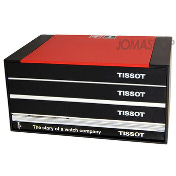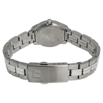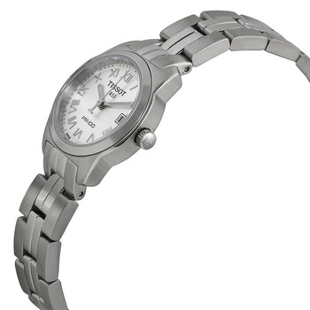 Stainless steel case with a stainless steel link bracelet. Fixed stainless steel bezel. Silver dial with luminous hands and Roman numeral hour markers. Minute markers around the outer rim. Luminescent hands. Date display appears at the 9 o'clock position. Quartz movement. Scratch resistant sapphire crystal. Push / pull crown. Solid case back. Case diameter: 24.5 mm. Case thickness: 8 mm. Bracelet width: 12 mm. Fold over clasp with push button release.Water resistant at 100 meters / 330 feet. Tissot PR 100 Stainless Steel Ladies Watch T049.210.11.033.00