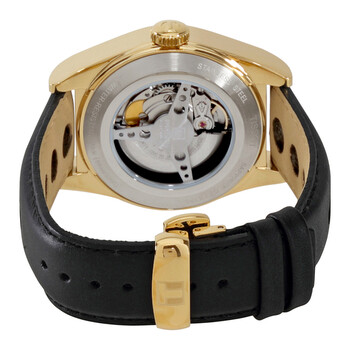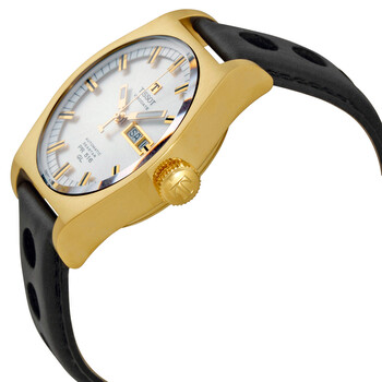 Gold-tone stainless steel case with a black leather strap. Fixed gold-tone bezel. Silver dial with luminous gold-tone hands and index hour markers. Minute markers around the outer rim. Dial Type: Analog. Luminescent hands and markers. Day of the week and date display at the 3 o'clock position. ETA 2836-2 automatic movement with a 40-hour power reserve. Scratch resistant sapphire crystal. Transparent case back. Case dimensions: 39.6 mm x 40 mm. Case thickness: 12.98 mm. Round case shape. Band width: 20 mm. Jewelry clasp. Water resistant at 100 meters / 330 feet. Functions: date, day, hour, minute, second. Casual watch style. Watch label: Swiss Made. Tissot PR 516 Automatic Silver Dial Men's Watch T071.430.36.031.00.
