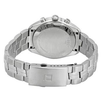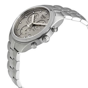 Stainless steel case with a stainless steel bracelet. Fixed stainless steel bezel. Rhodium dial with luminous silver-tone hands and index hour markers. Minute markers around the outer rim. Dial Type: Analog. Luminescent hands and markers. Date display between the 4 and 5 o'clock positions. Chronograph - three sub-dials displaying: 60 second, 30 minute and 1/10th of a second. Quartz movement. Scratch resistant sapphire crystal. Solid case back. Case diameter: 41 mm. Case thickness: 10.71 mm. Round case shape. Fold over clasp with a safety release. Water resistant at 100 meters / 330 feet. Functions: chronograph, date, hour, minute, second. Casual watch style. Watch label: Swiss Made. Tissot PR100 Chronograph Rhodium Dial Stainless Steel Men's Watch T1014171107100